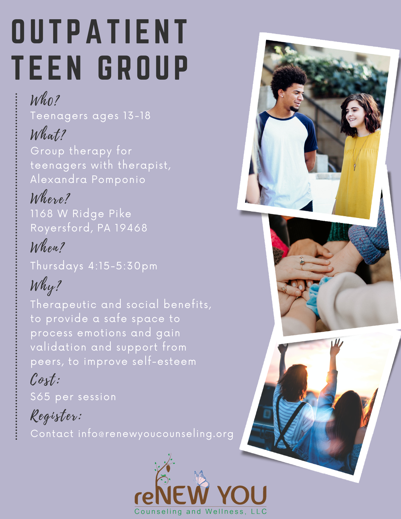 Currently offered: Weekly outpatient co-ed group for teens 13-18 years old offered at each location