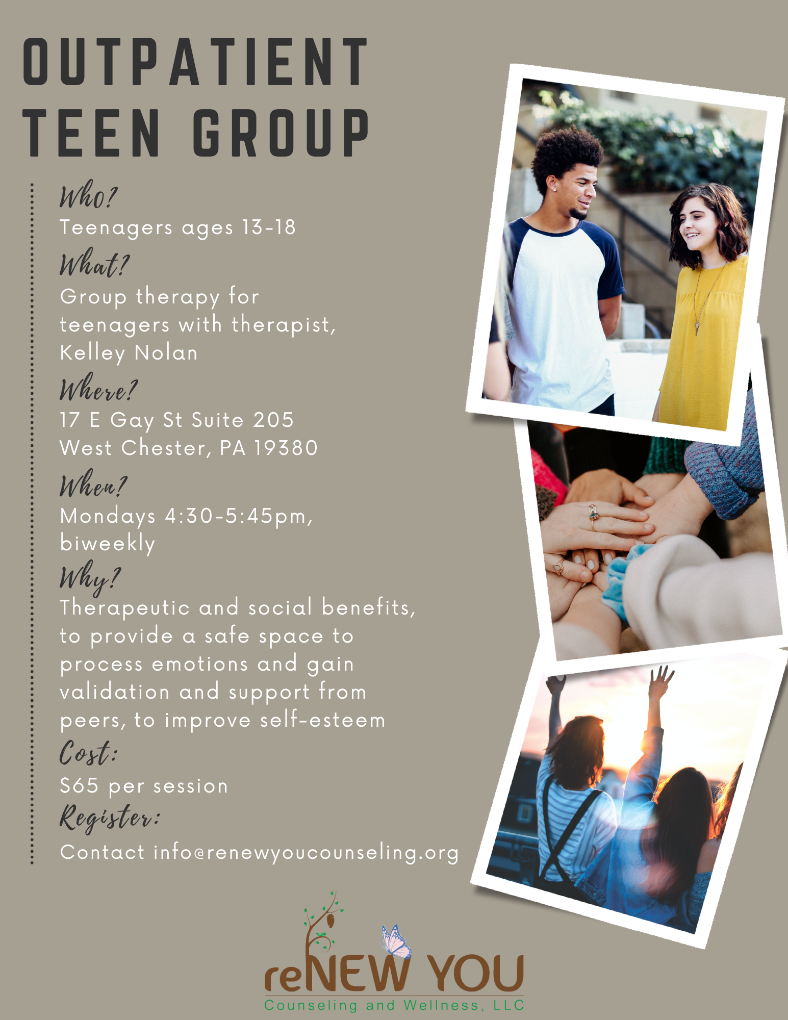Group therapy has been researched and proven to be effective for all people though especially children, teens, and young adults. We believe not only in the therapeutic benefits but also the social benefits. It is a safe space to process emotions and gain validation and support from peers which offers a sense of belonging and acceptance and helps to build self esteem in a multitude of ways.